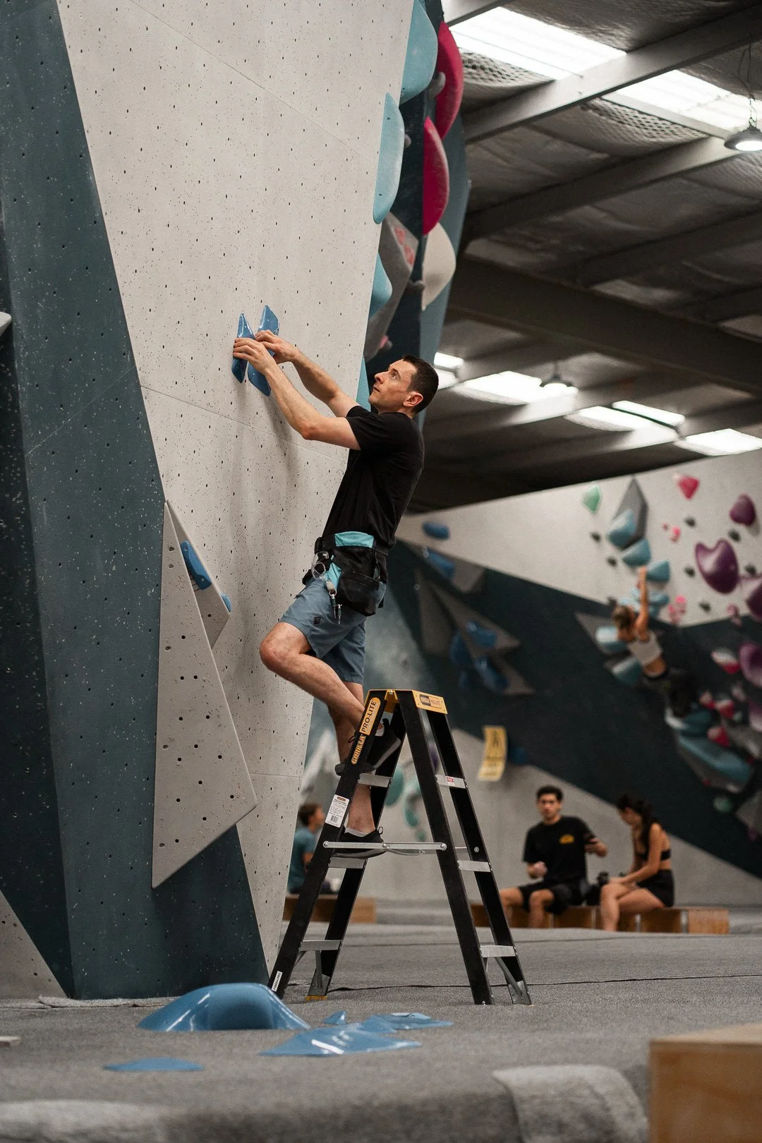 The vast majority of my setting work has been commercial setting locally for 9 degrees but I've also been fortunate enough to do my fair share of guest sets, travelling, clinics and setting competitions over the years - not to mention having brought over or had in many talented setters from other gyms and places around the world.